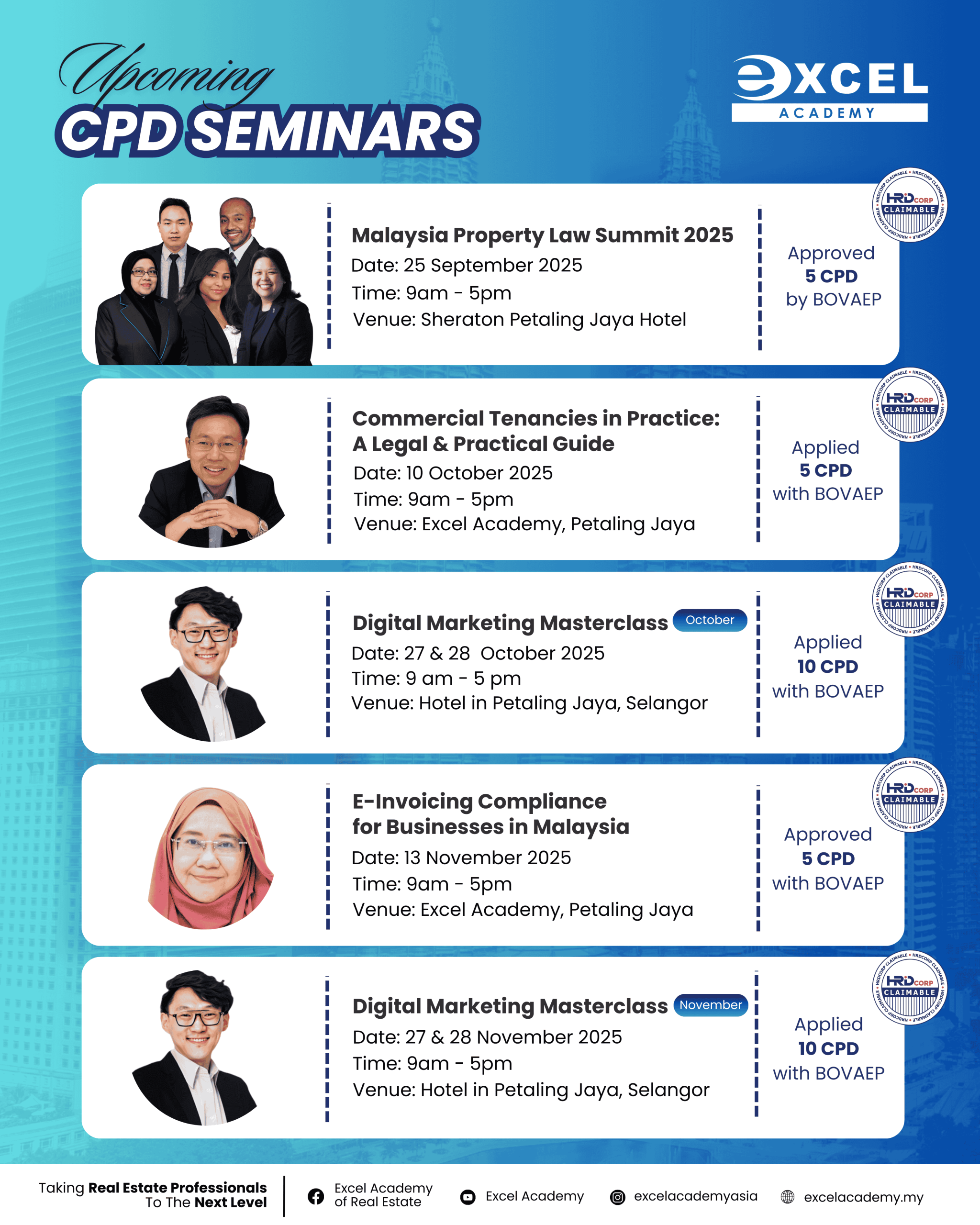 #excelacademy #cpdseminars #realestate #bovaep #hrdcorp #stratalaw #act757 #tenancy #digitalmarketing #einvoicing #compliance #malaysiaevents