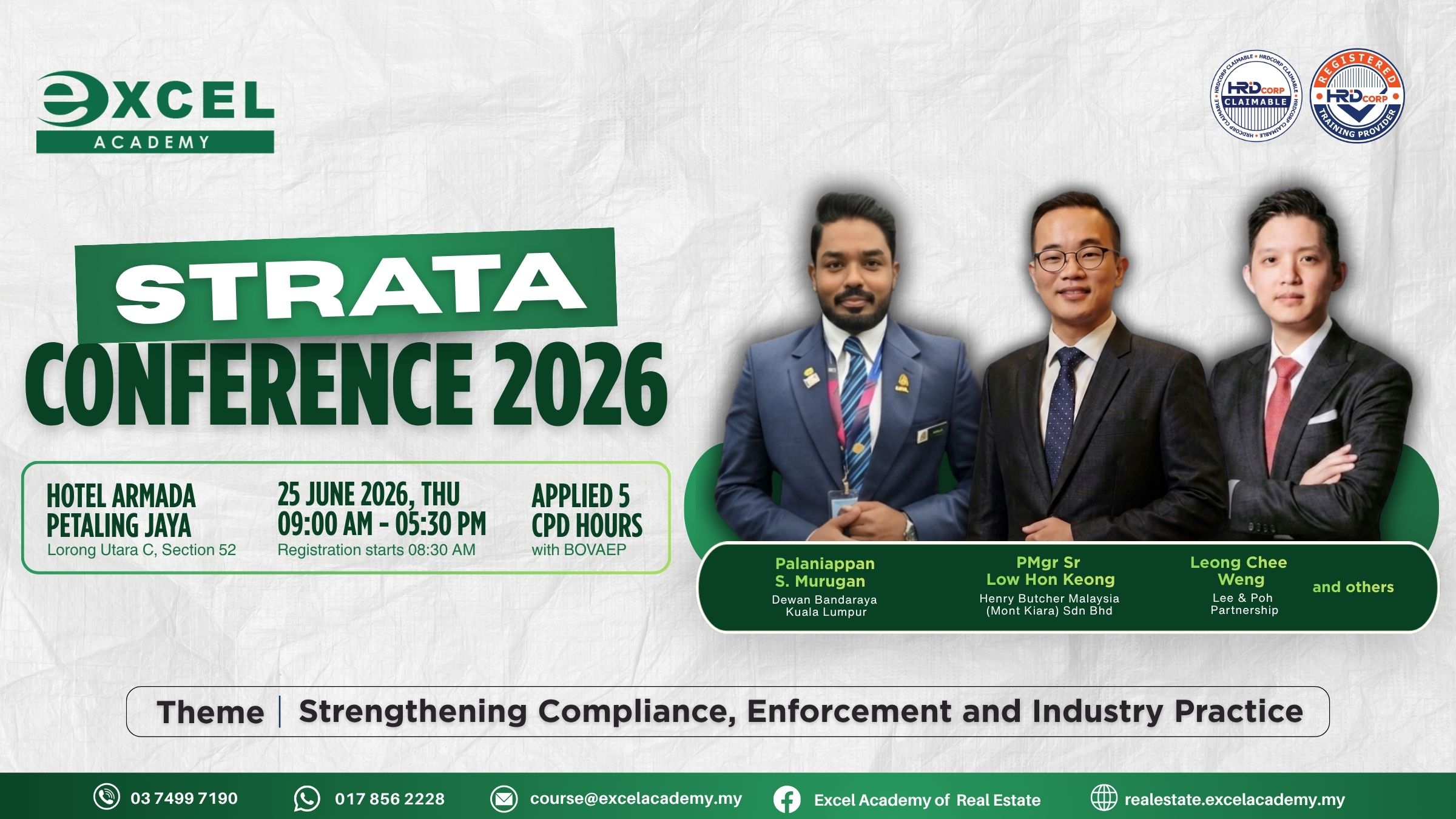 Armada Hotel, PJ Lot 6, Lorong Utara C, Section 52, Darul Ehsan, Petaling Jaya, Selangor, Malaysia๐ฃ ๐๐๐๐๐๐ ๐๐๐๐ ๐๐๐๐๐๐ ๐๐๐๐ ๐๐ ๐๐๐๐ ๐๐๐๐ ๐๐ญ๐ก ๐๐๐๐๐๐๐ As Malaysiaโs strata developments continue to grow rapidly, the need for stronger governance, smoother operations, and clearer compliance has never been more critical. From disputes among residents, delayed maintenance issues, weak enforcement, financial mismanagement, to confusion over legal responsibilities, these are real challenges faced daily by JMBs, MCs, developers, property managers, and stakeholders across the industry. In response to these growing industry needs, Excel Academy proudly presents the return of Strata Conference 2026 for its 7th edition, featuring a timely and impactful theme: Strengthening Compliance, Enforcement and Industry Practice. ๐๐จ๐ง๐๐๐ซ๐๐ง๐๐ ๐๐๐ญ๐๐ข๐ฅ๐ฌ โ [...]