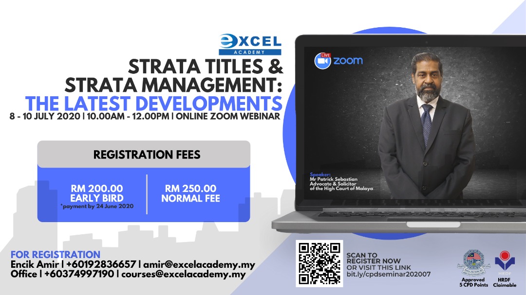 The COVID-19 pandemic and enforcement of MCO has brought about rapid changes and challenges in all industries including property management. To support property developers and real estate professionals during this challenging time, Excel Academy will be hosting an online webinar on Strata Titles & Strata Management: The Latest Development on 8 – 10 July 2020 via Zoom. Register now at https://bit.ly/cpdseminar202007 or call/WhatsApp us at 0192836657 (Amir) or email at courses@excelacademy.my for more information.